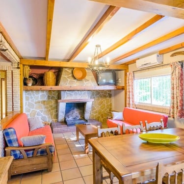 El alma de la casa: Un salón acogedor con chimenea para las charlas nocturnas y aire acondicionado para los días de sol.